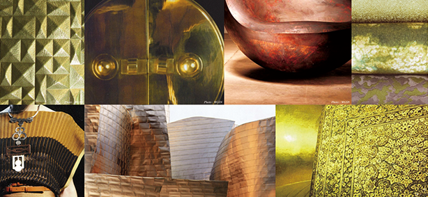 Nuanced gold with pink, yellow, and orange, or deep shades like oxidized, tarnished, and antique look.